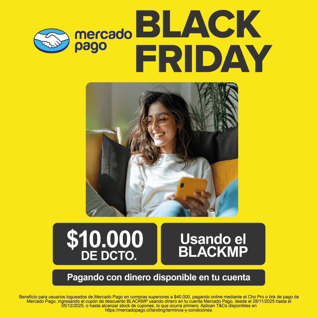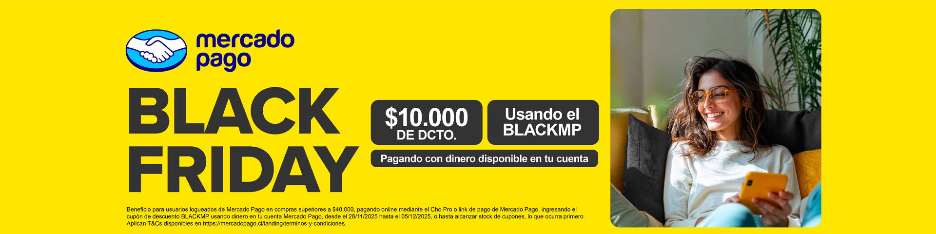 "Promoción Black Friday válida del 28/11/2025 al 01/12/2025 o hasta agotar stock. Usa el cupón BLACKMP y obtén $10.000 de descuento pagando con Account Money en compras sobre $40.000 en comercios adheridos. Máximo 1 cupón por usuario. Aplican TyC disponible en www.mercadopago.cl."